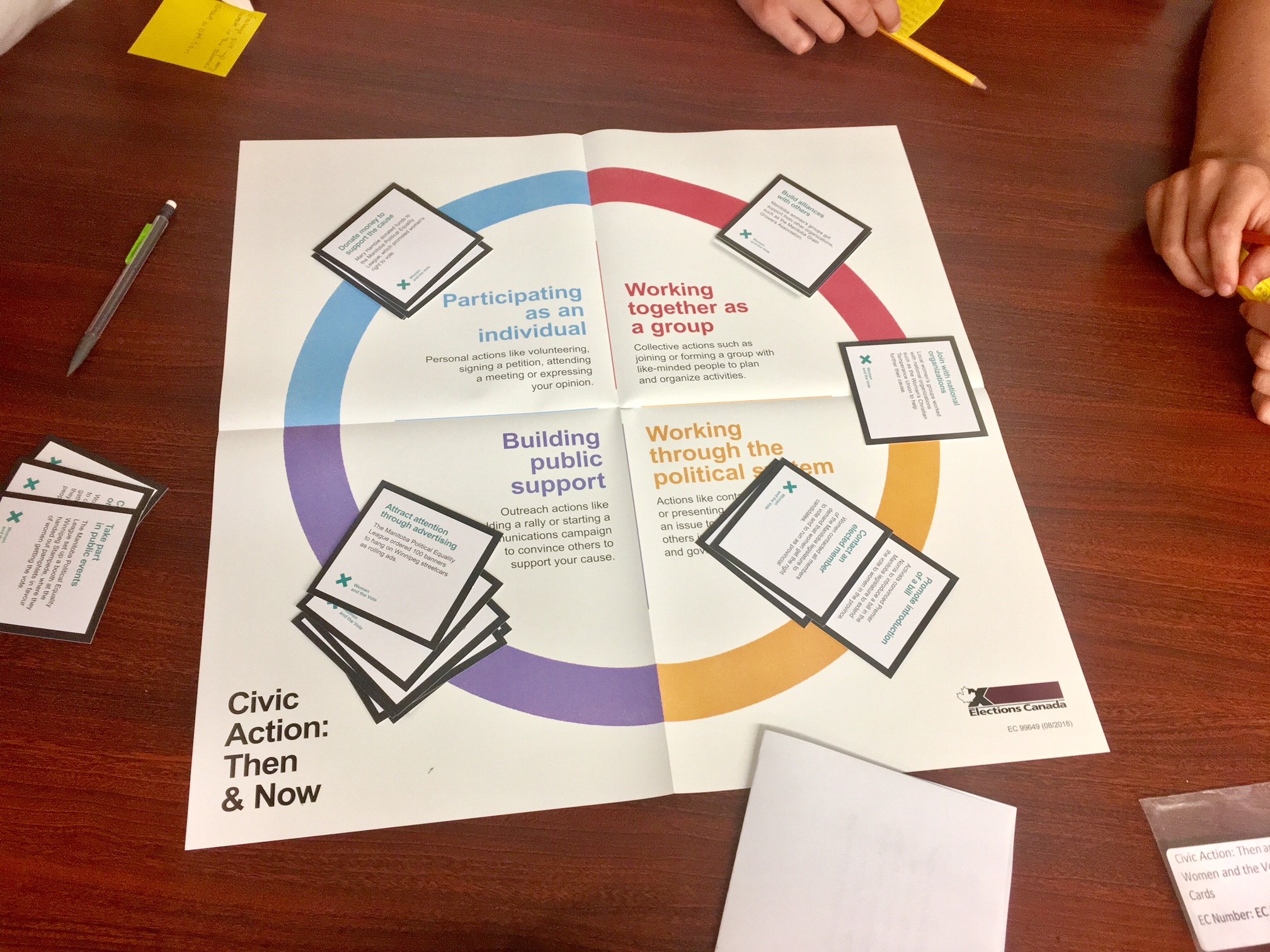 Students focused on women’s suffrage, one of several available case studies, and the actions of women from a century ago. The actions, which were written on cards, included creating a group of local supporters, signing a petition, and contacting an elected member.