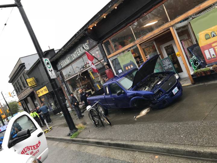 There, the truck collided with a Mazda sedan before crashing into an unoccupied drum store, according to police. Photos from the scene showed the truck with front-end damage and missing one wheel.