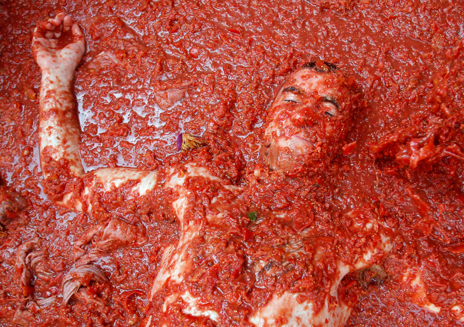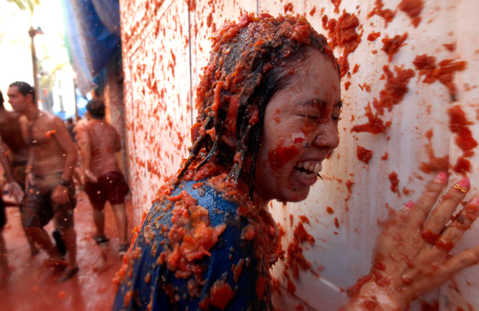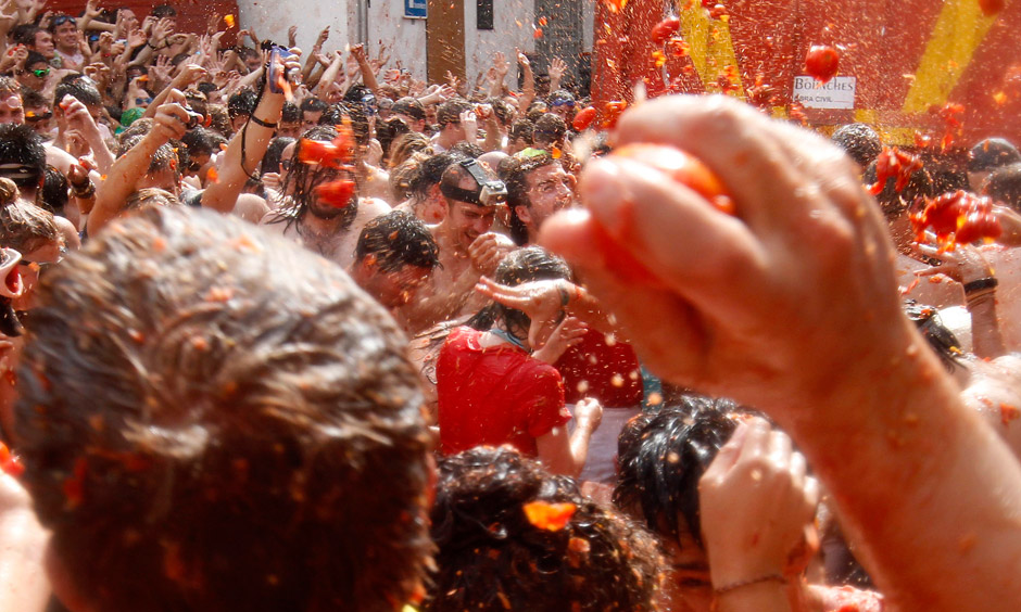 Officials estimated more than 40,000 people, some from as far away as Japan and Australia, took up arms Wednesday and pelted each other with 120 tons of ripe tomatoes in the yearly food fight known as the ‘Tomatina’ now in its 66th year.