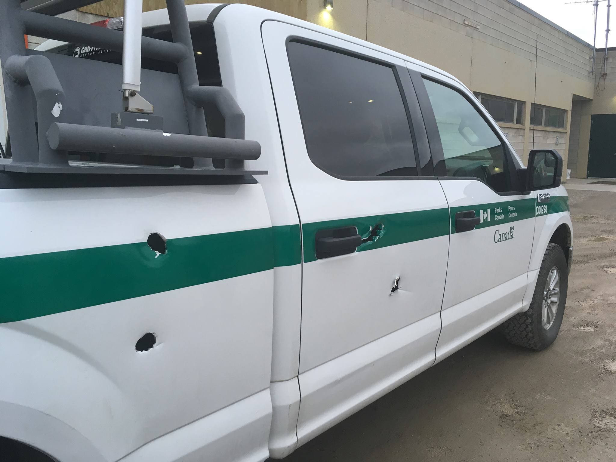 The post features a photo of a Parks Canada staff truck with four large puncture holes in the side — two in the rear passenger door and two in the back of the truck — made by none other than an angry, charging elk.