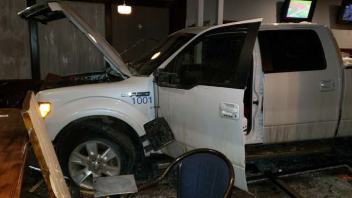 Police were called to the Lion’s Den Pub at the Quality Inn shortly before 10 p.m. after a report that a truck had driven between two pillars and through the doorway of the pub.
