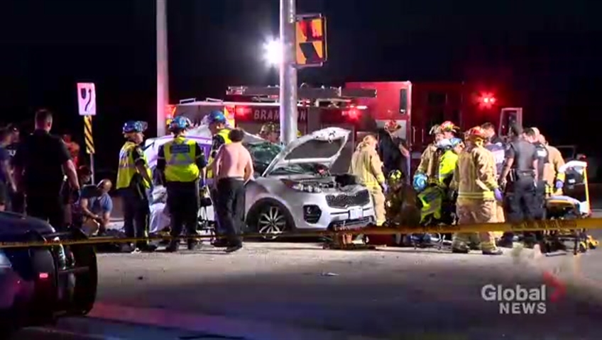 Peel regional police say the crash between an SUV and sports car happened on Aug. 4 in Brampton, Ont., at about 9 p.m.