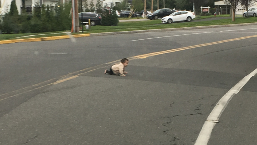 A photo shows the baby on her hands and knees crossing the centre yellow line.