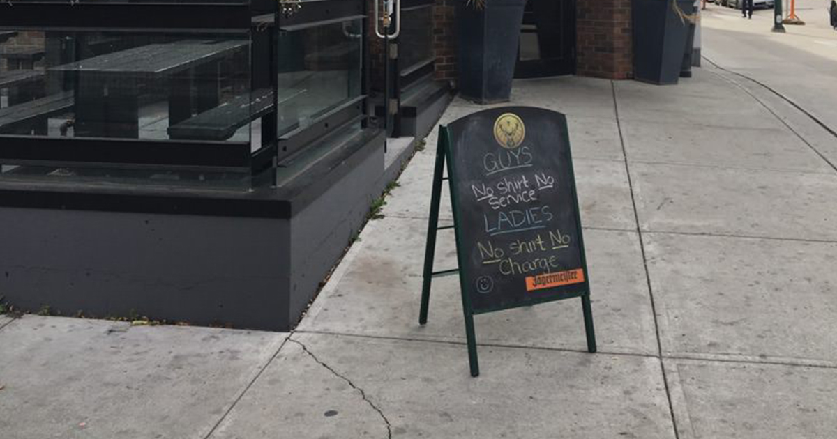 The sign outside the Hostel Bar, a pub on Calgary’s 17 Avenue SW, is raising some concerns. On Wednesday, on its sandwich board, a staff member wrote, ‘Guys, no shirt, no service. Ladies no shirt no charge.’