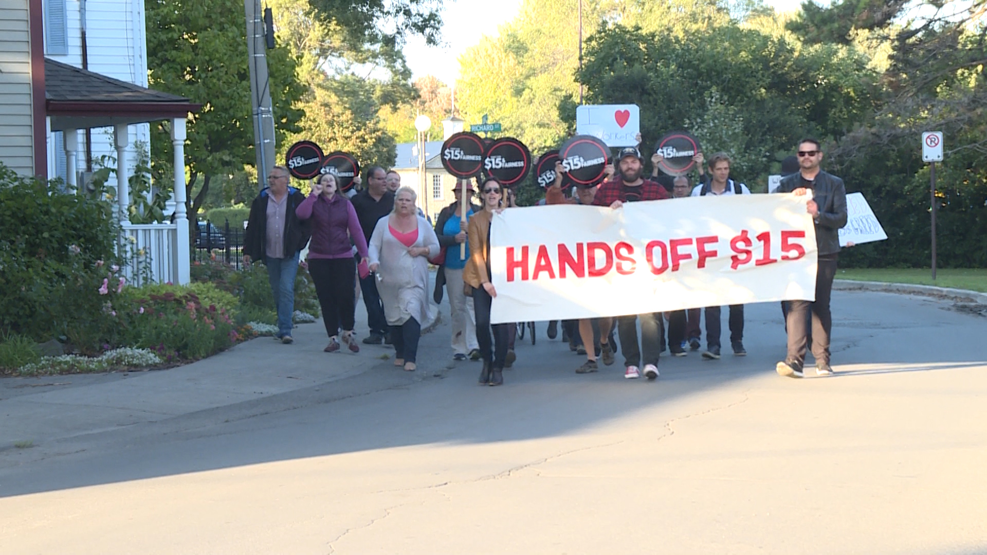 About 40 people recently gathered to protest the Kingston Chamber of Commerce’s stance on minimum wage in the province, voicing their views outside a local conference centre where the organization was holding a business expo.
