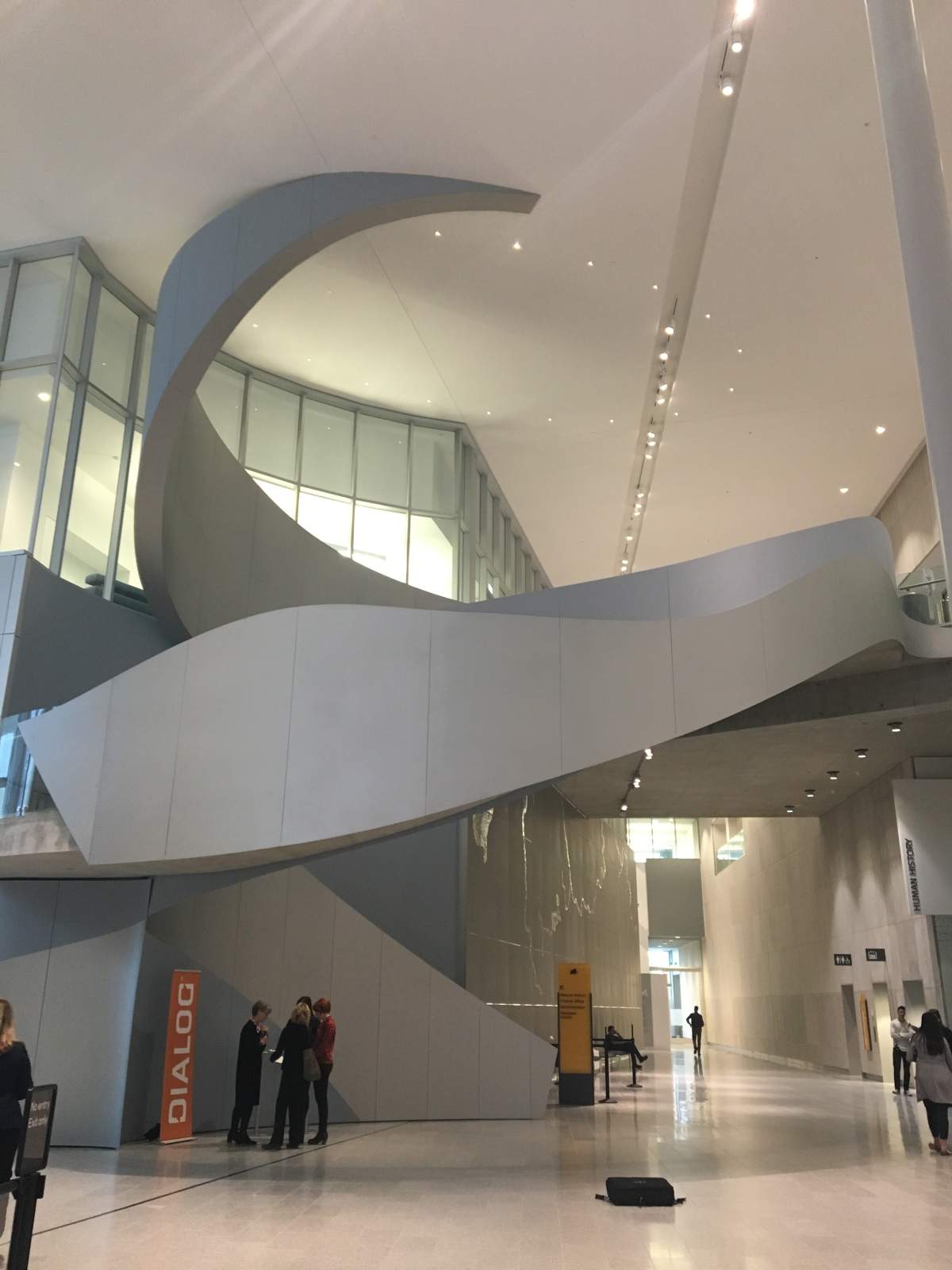 The focal point of the lobby is the reinforced concrete feature staircase. Construction workers and designers worked around the clock for 25 weeks to come up with the vision for the staircase.