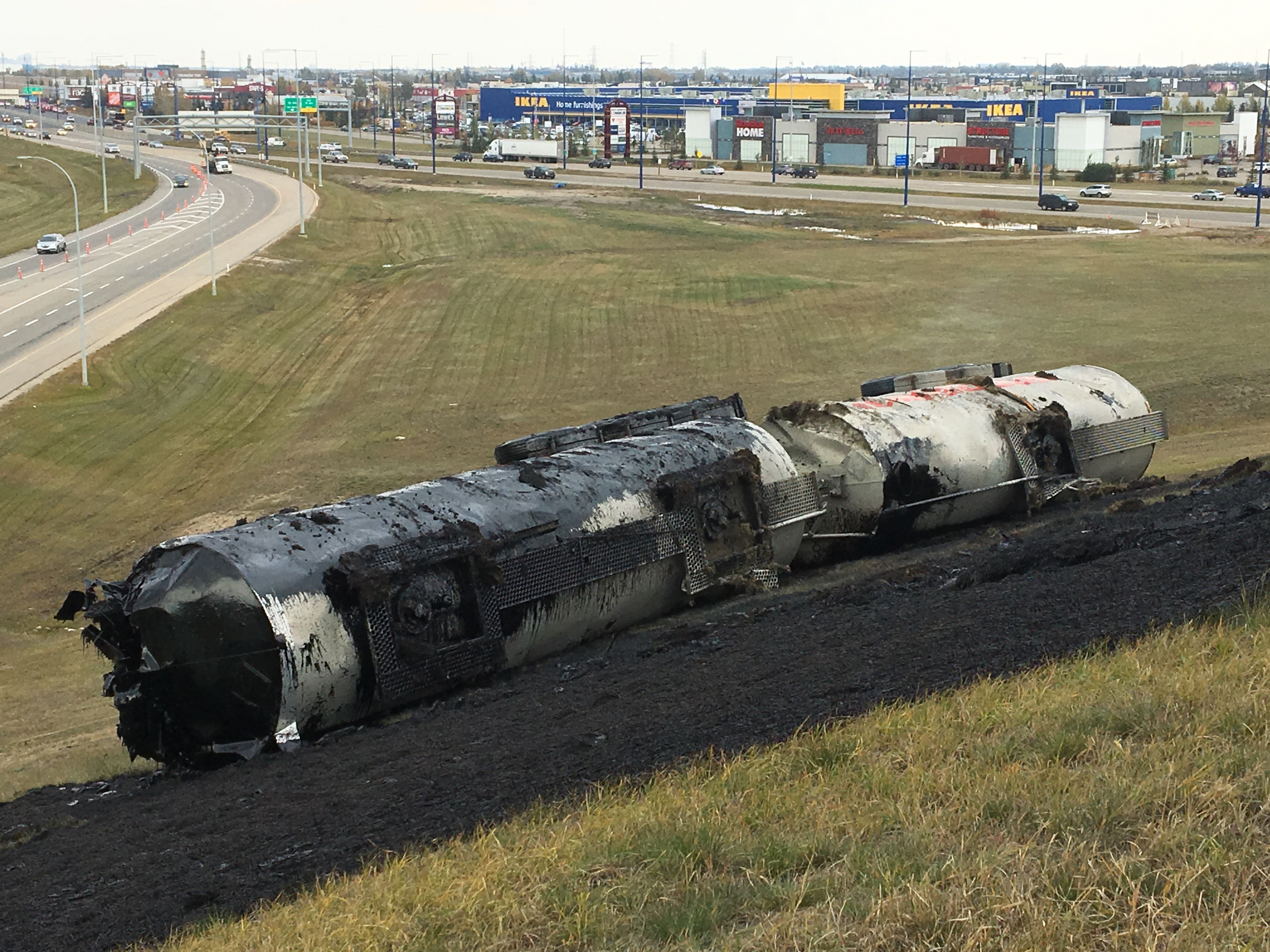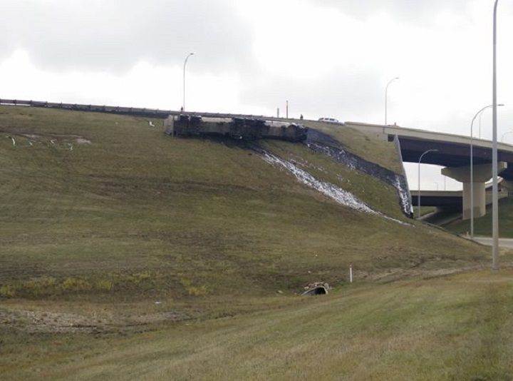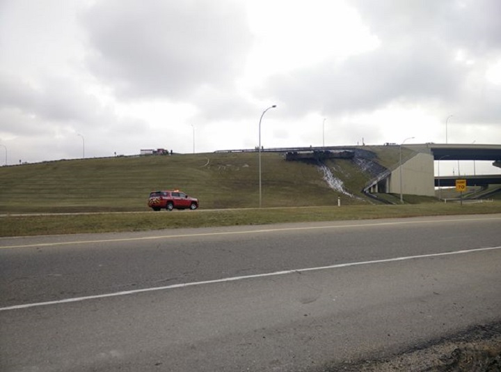 Edmonton police said the truck was driving on the exit ramp leading from westbound Anthony Henday to Calgary Trail when the trailer became loose on the curved ramp. It happened at around 1:40 p.m. Monday.