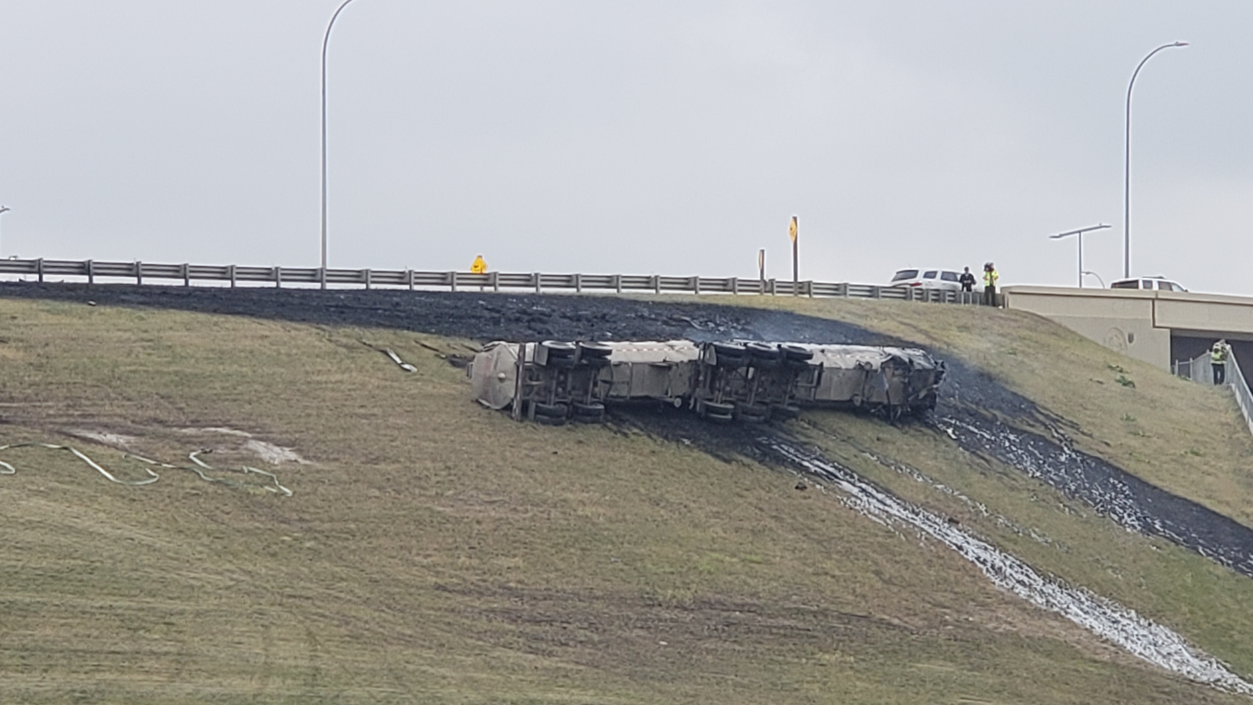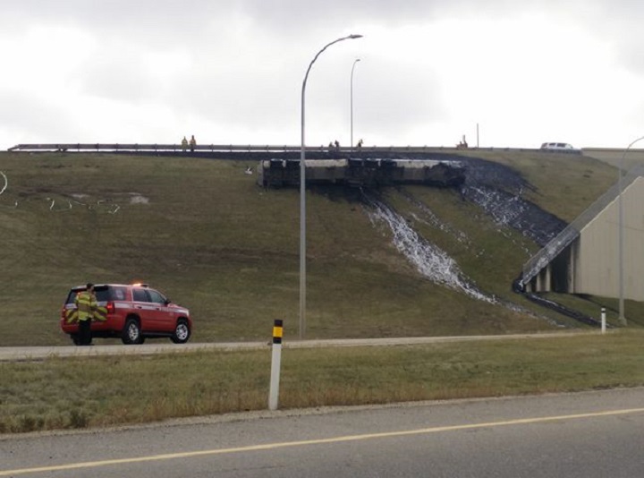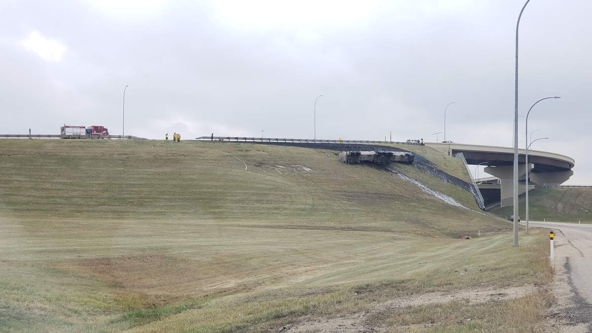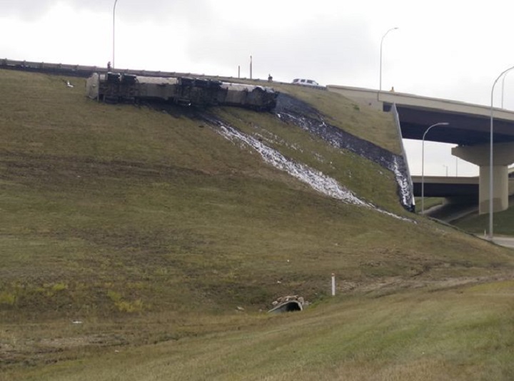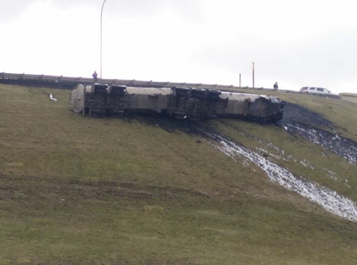The truck was hauling hot, liquid asphalt when it flipped. Pitman said the front of the trailer ripped out and about 70 per cent of the 37,500 litres of asphalt spilled down the embankment and into a provincial storm sewer system.