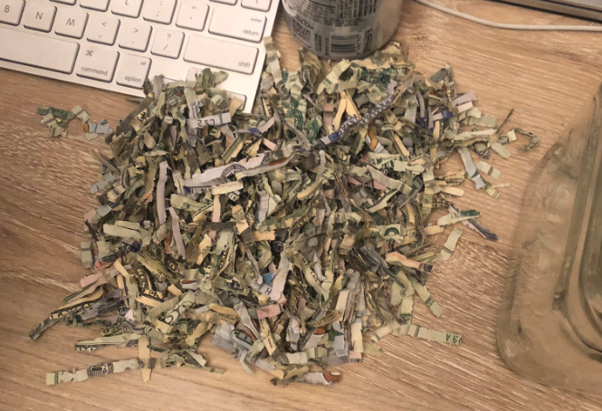 There was the money — in pieces, in the shredder, after Leo had put it through the blades.