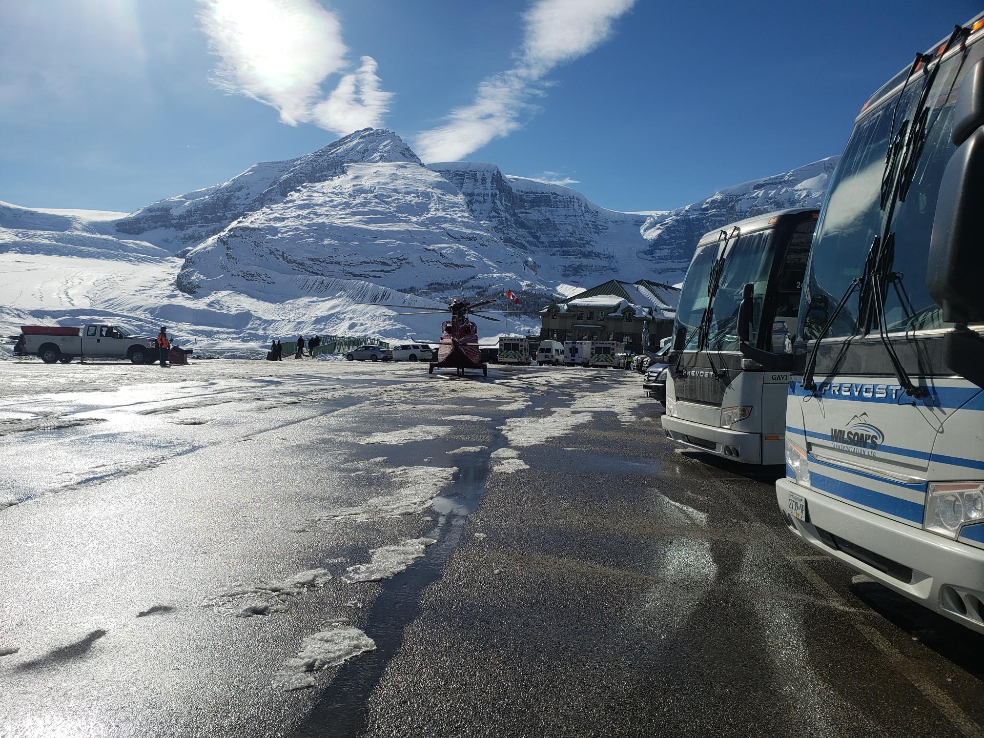 A tour bus driver is dead after being struck by her vehicle in the parking lot of the Columbia Icefield Discovery Centre on Thursday.