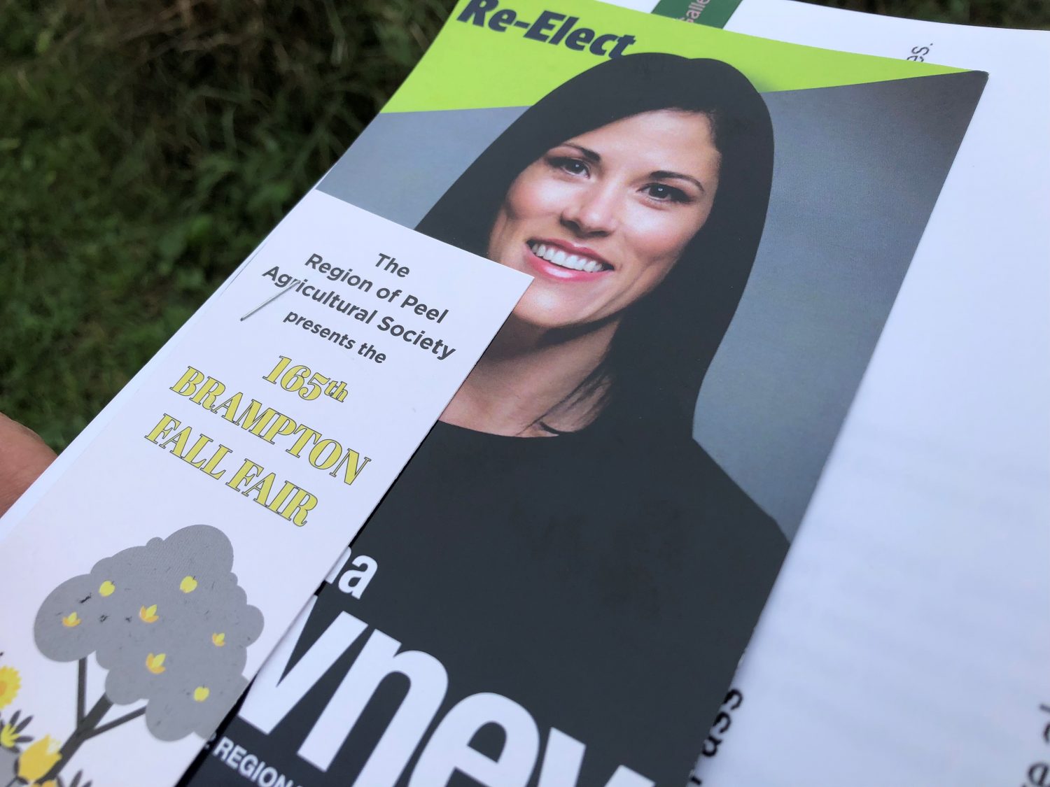 Outside the early polling station, Corrigan showed off one of Downey’s mailers with a ticket to the Brampton Fall Fair stapled to it. The ticket is for free entry to the fair for a child, which Corrigan said would have cost $5 at the fair gates.