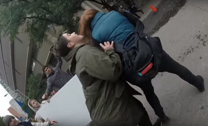 The attacker can then be seen throwing a dolly and shoving Katie Somers, another anti-abortion protester. The attacker appears to reach into Somers’ backpack, pull out an object and smash it on the ground before continuing to shove her.