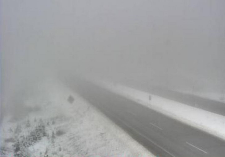 Courtesy of overnight precipitation, snow is blanketing the higher elevations of the Okanagan Connector, though the highway itself is clear. Highway cameras show that the Pennask Summit, at an elevation of 1,717 metres, has snow, as does the Elkhart section. Notably, though, the Brenda Mine section is clear of snow, though the highway is wet.