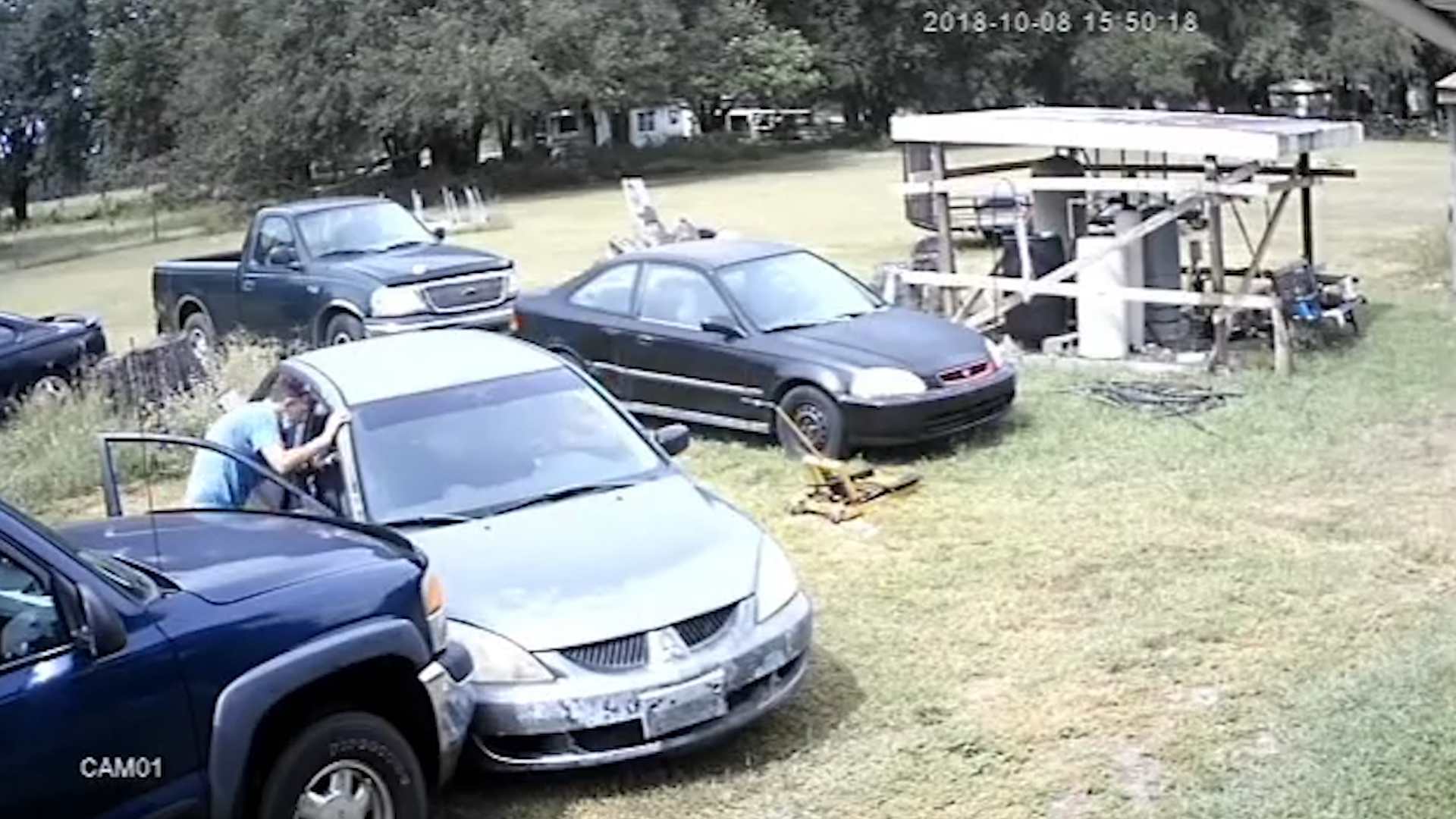 Their car drives down the dirt road and off camera without the owner being seen leaving the vehicle.