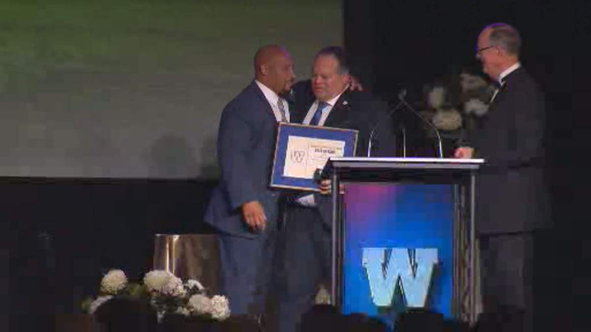 Former Blue Bombers receiver Robert Gordon and team president Bob Miles were inducted into the club’s Hall of Fame.