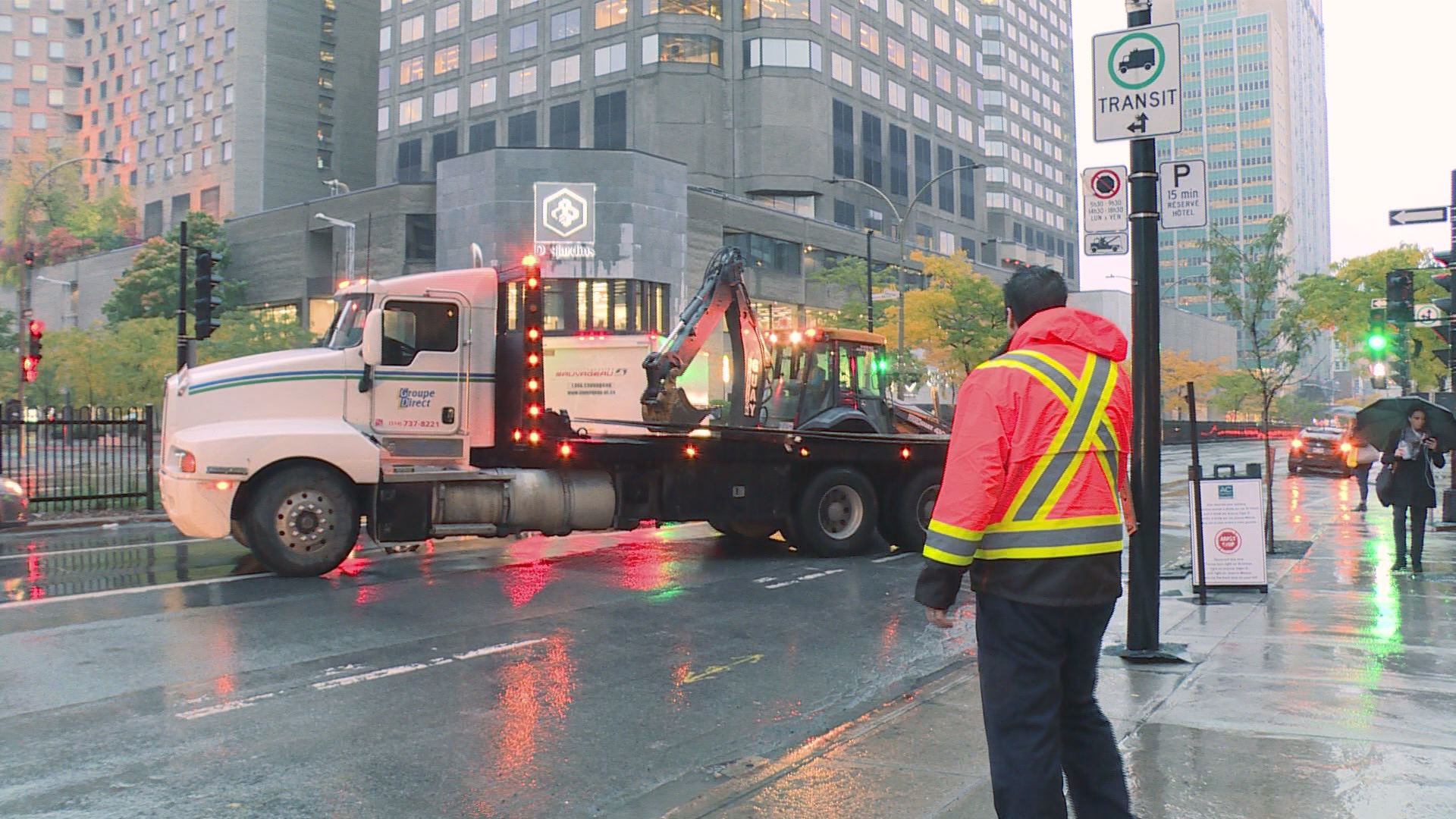 Just a few minutes after Global News joined Galleguillos for a ride-along at 7 a.m. Thursday, the inspector came upon a traffic mess on Réné-Levesque Boulevard.