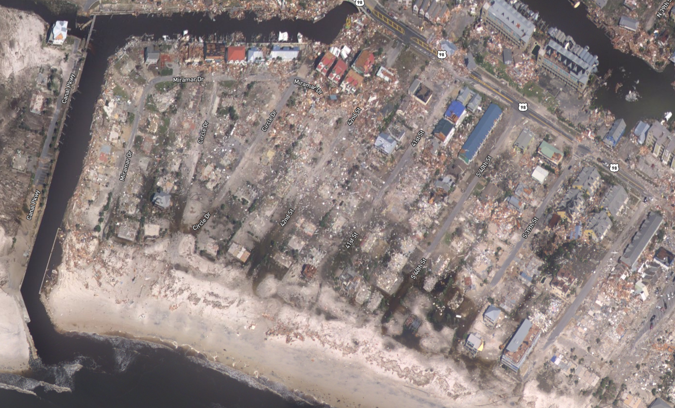 Satellite images provided by the National Oceanic and Atmospheric Administration (NOAA) show a path of destruction right through Mexico Beach, with buildings levelled and debris strewn far and wide.
