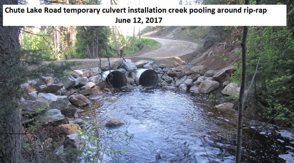 A culvert on Chute Lake Road, at the 8 kilometre mark on the south side of the Chute Lake Lodge, disappeared in May, 2017, when torrential rains caused Chute Lake to overflow and flood the creek.