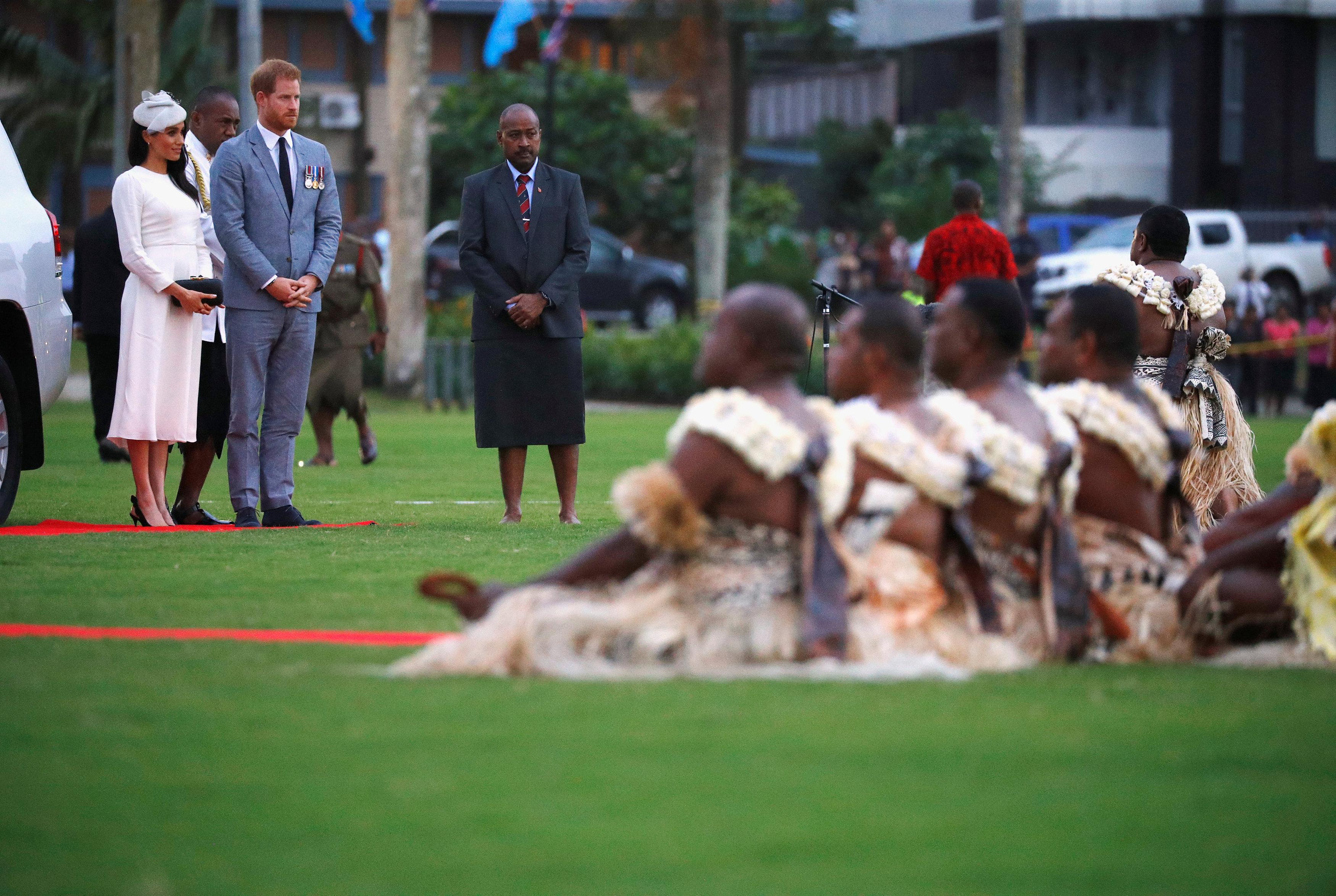 Harry and Meghan will be feted in a ceremony at a park in Suva, mirroring a welcome for Queen Elizabeth in 1953. Men in traditional skirts with garlands of leaves and flowers lined up waiting to perform a ceremony.