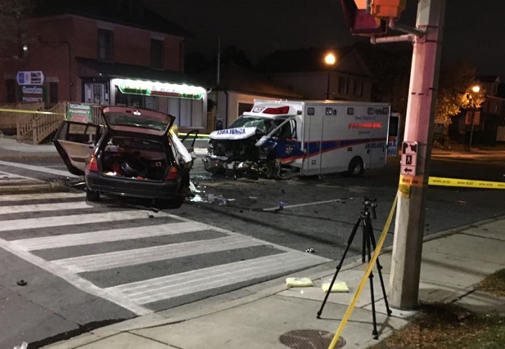 Police said it’s believed the Peel Paramedics ambulance was waiting to turn onto McMurchy Avenue from Queen Street West when a BMW crashed into it head-on.