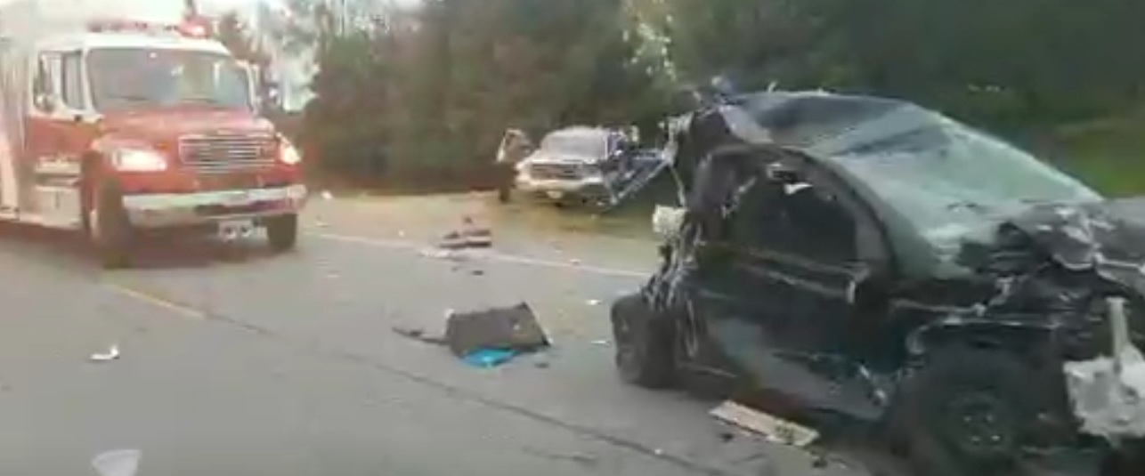 A periscope video that Sanchuk posted to Twitter from the scene shows the wreckage of the crash: a flatbed vehicle with a load of pipe is in a ditch next to a pickup truck with a crumpled cargo bed. Another pickup is in the roadway, near a heavily damaged black car.