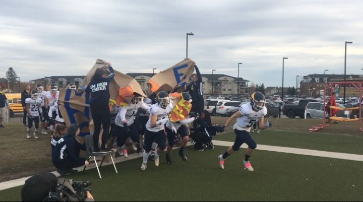 The team, wearing blue-and-yellow ribbons, tore through a banner on the field before gathering with their opponents, Crescent Heights High School, for a moment of silence in memory of their fallen teammate.