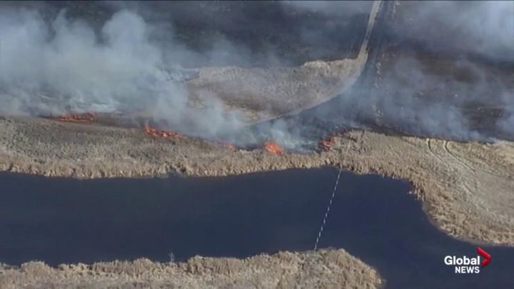 WATCH: Global1 captured footage of a grassfire burning east of Calgary on Friday.