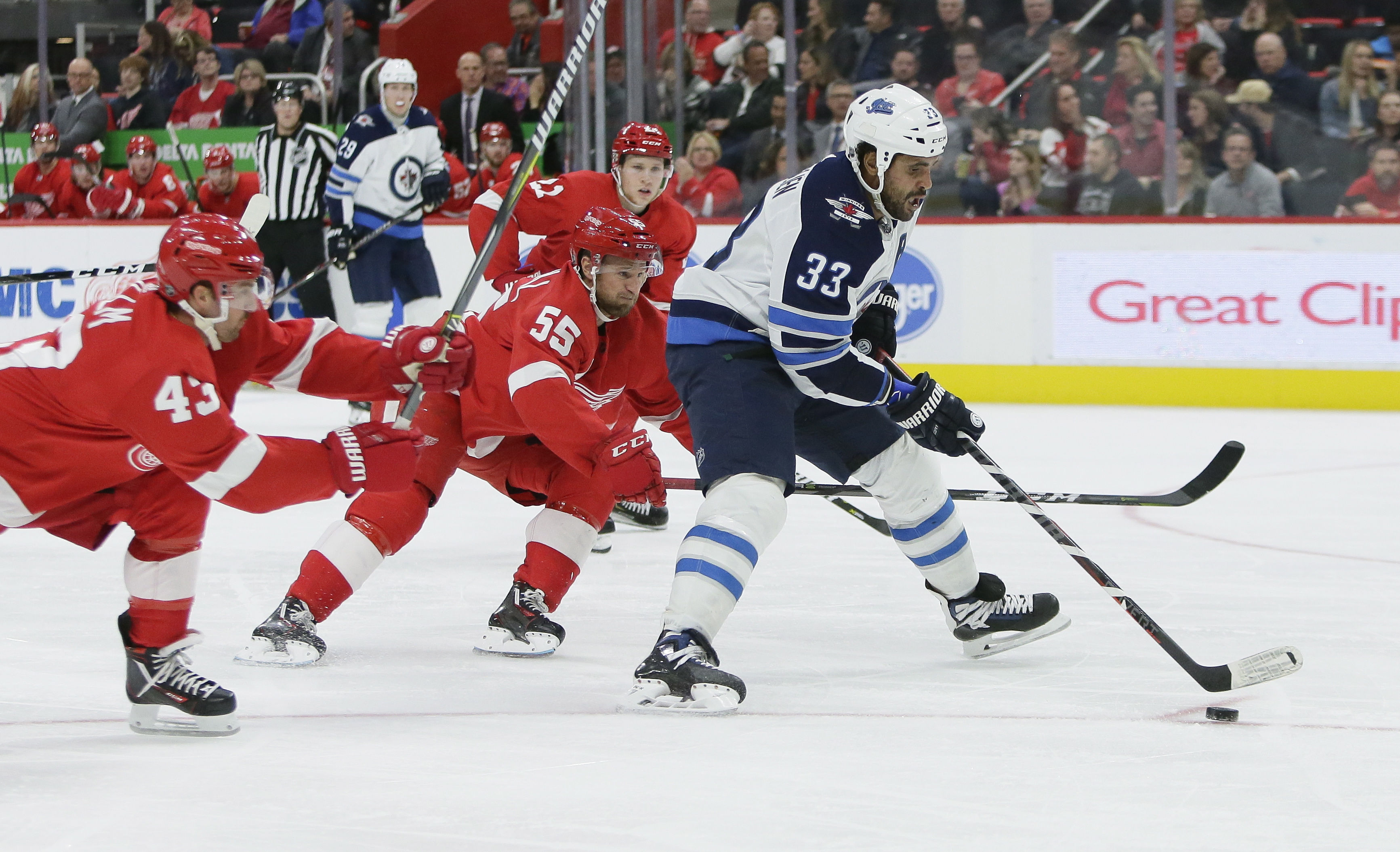 Defenceman Dustin Byfuglien got his 500th career point when he snapped a tie with 6:45 left, and the Winnipeg Jets beat the Detroit Red Wings 2-1 on Friday night.