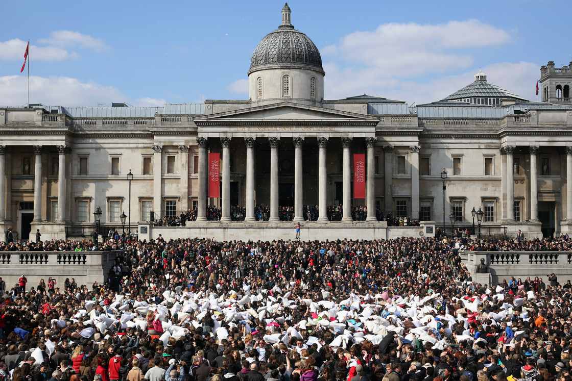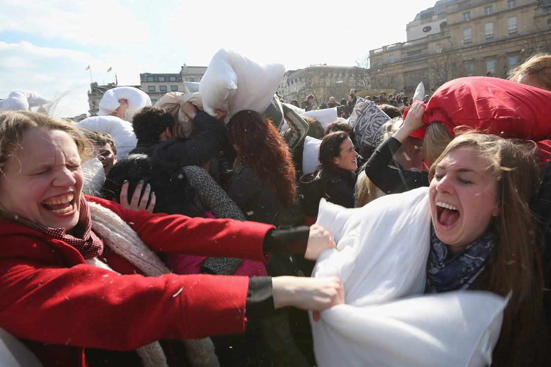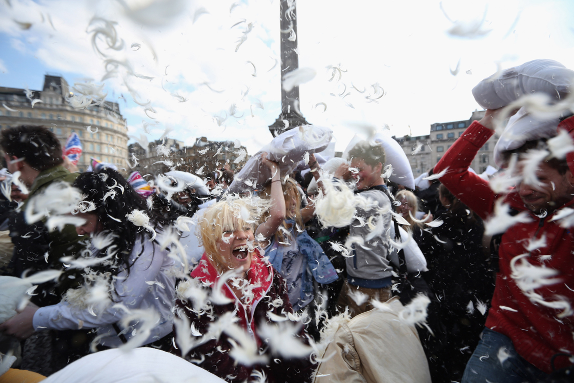 Photos from a giant pillow fight that broke out in Trafalgar Square on International Pillow Fight Day April 6, 2013 in London, England. Mass public pillow fights were arranged in numerous cities around the world as part of the ‘Urban Playground Movement’ which facilitates free, public non-commercial events.