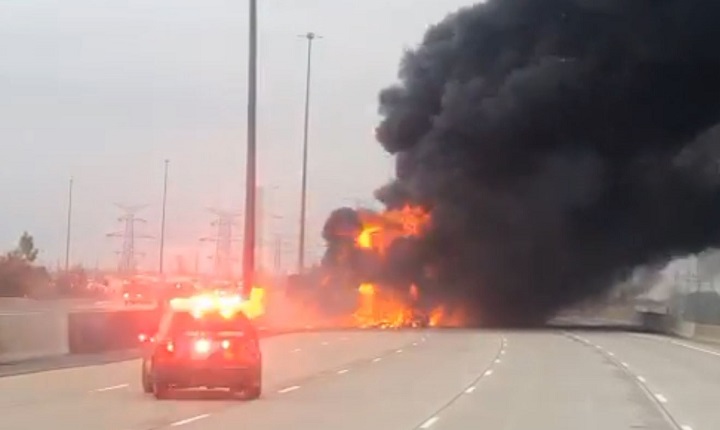 “The fuel tanker truck burst into flames upon collision with another passenger vehicle. Both vehicles came to rest on the eastbound side of the 407,” OPP Sgt. Kerry Schmidt told reporters late Wednesday evening.