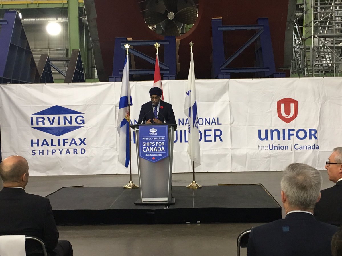 Defence Minister Harjit Sajjan told hundreds of workers gathered in the vast facility on the Halifax waterfront that the vessel would be built in Halifax.