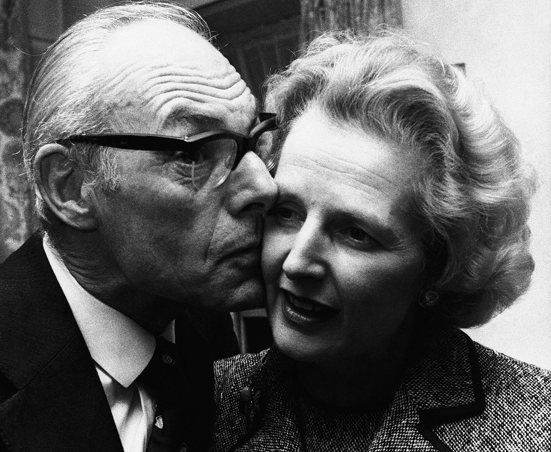 Photo caption: In a Feb. 4, 1975 file photo, Margaret Thatcher gets a kiss from her husband Denis in London, Feb. 4, 1975, after she had come out on top with 130 votes in the first round of the election for the Conservative party leadership.
