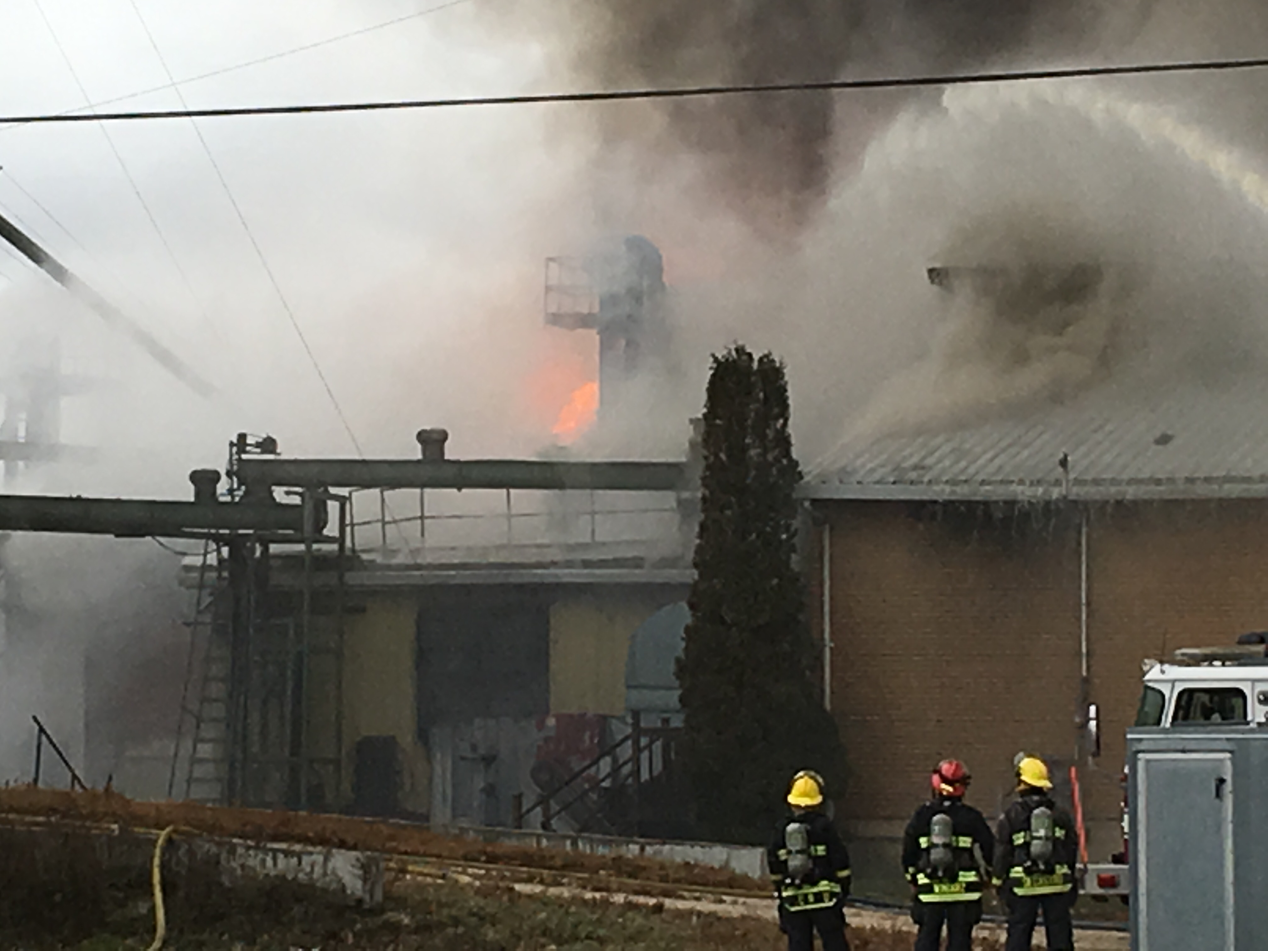 Fire crews were called to the scene at about 1:15 p.m. to battle the blaze at the oil seed processing plant.