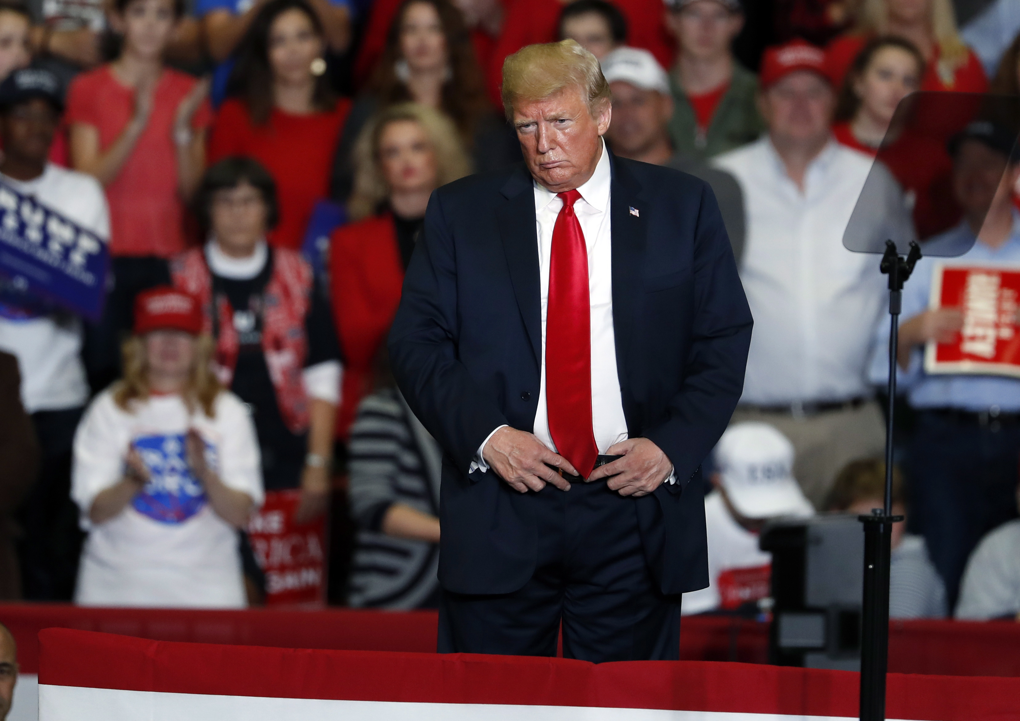 U.S. President Donald Trump paused one of his typically raucous rallies as the crowd broke into song while an elderly woman received treatment following a collapse at the Show Me Center in Cape Girardeau, Mo. on Monday night.