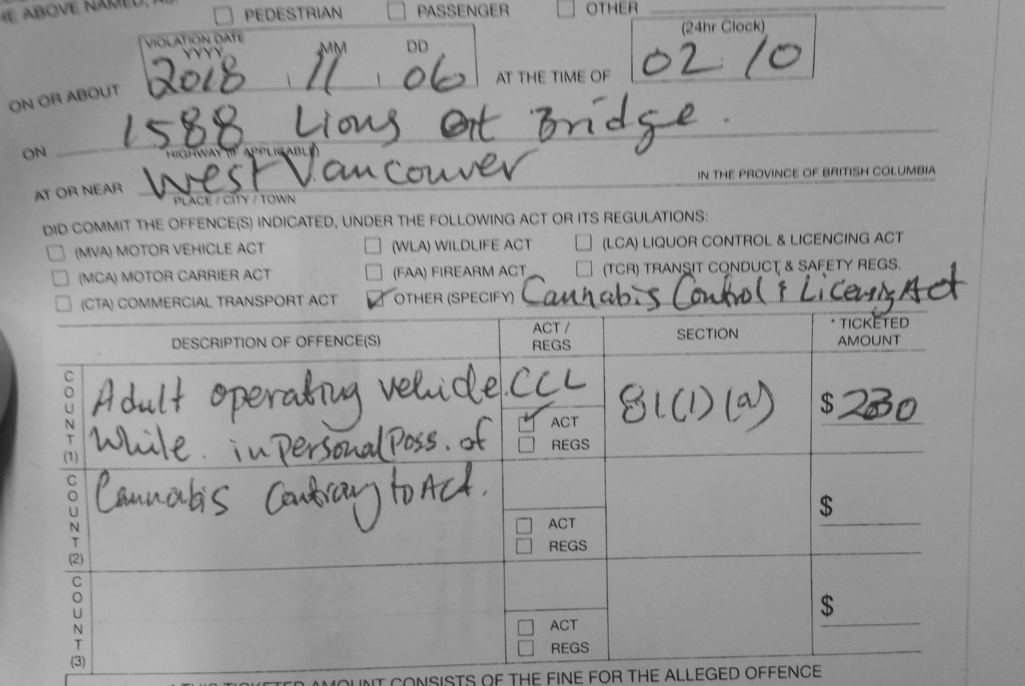 This is the first time West Vancouver police have issued a ticket under the new B.C. Cannabis Act.