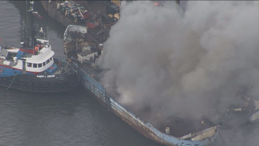 WATCH: The same barge caught fire on Oct. 30 but the fire was bigger that time.