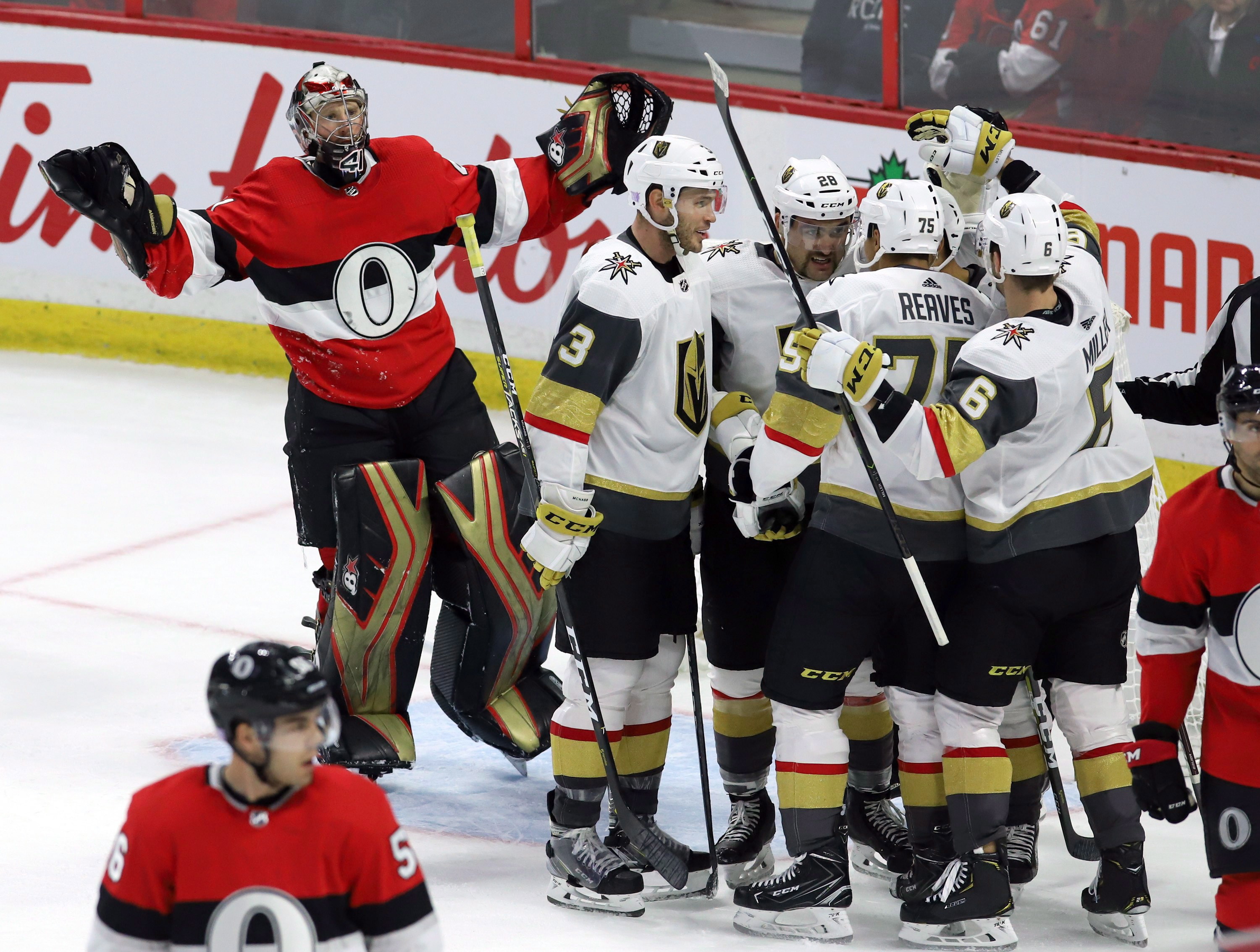 The Knights made it 5-3, the game’s final, score, as Bellemare had a wide-open net after Ottawa goalie Craig Anderson got tangled with Carrier. The Senators challenged for goaltender interference, but the call on the ice stood, bringing the crowd of 15,213 at Canadian Tire Centre to boo in unison.