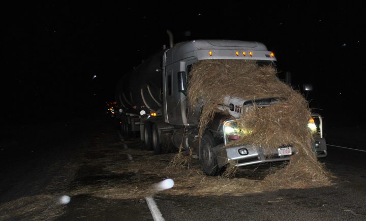 Police said a flat-deck truck was travelling south on Highway 21 when it lost a straw bale. An oncoming northbound semi-trailer collided with it, police said, which caused damage to the vehicle.
