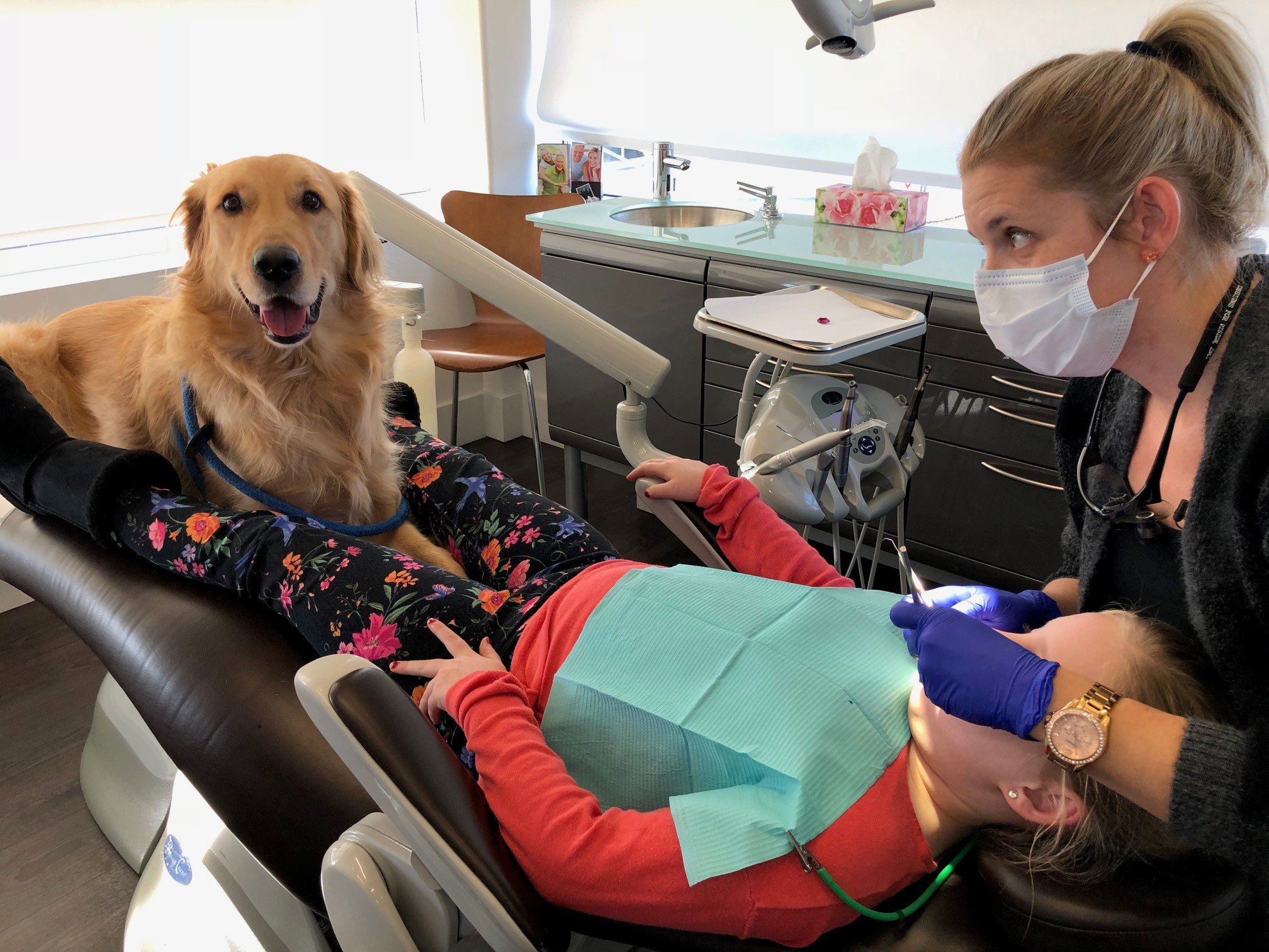 The clinic’s office manager, Scott Kennedy, is training his two-year-old Golden Retriever to become a very special kind of dental assistant.