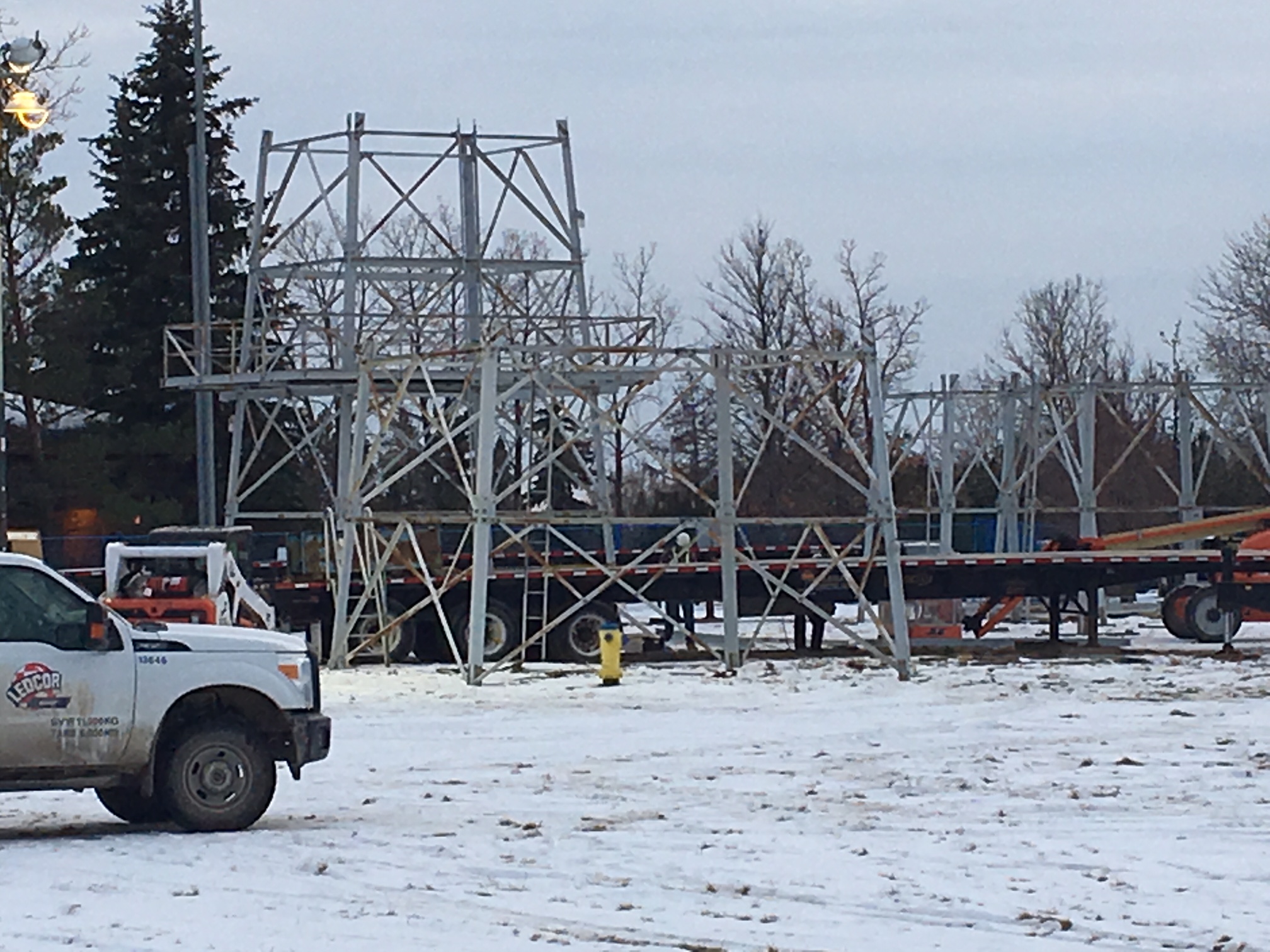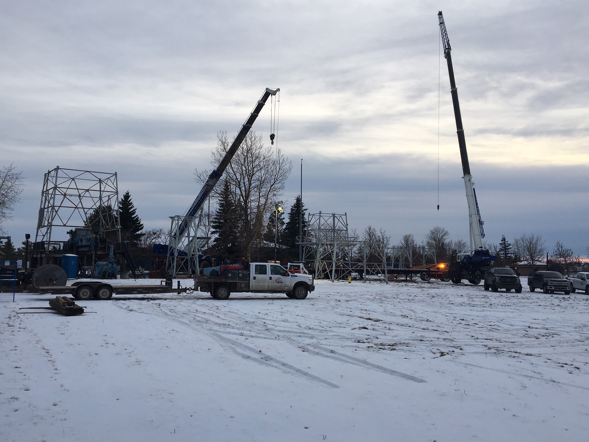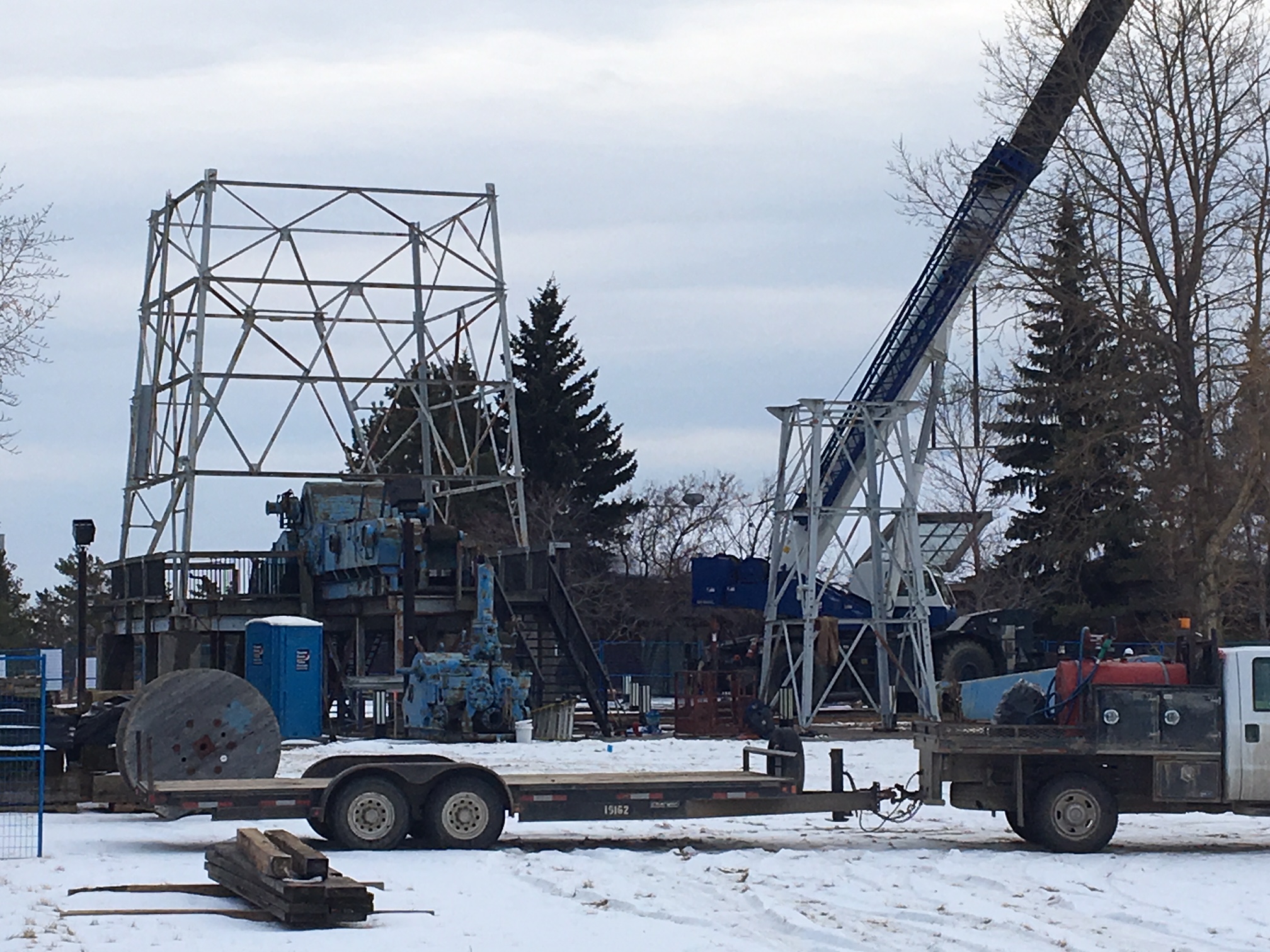 Work to dismantle the rig began at the old visitor centre early last week. Crews were back at the site Tuesday afternoon, where much of the oil derrick had been taken apart.