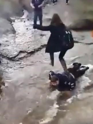 The video shows Corbett lying down in a stream surrounded by other students. A girl steps on his back to cross while at least 20 other students stand back and watch, some filming with their phones.