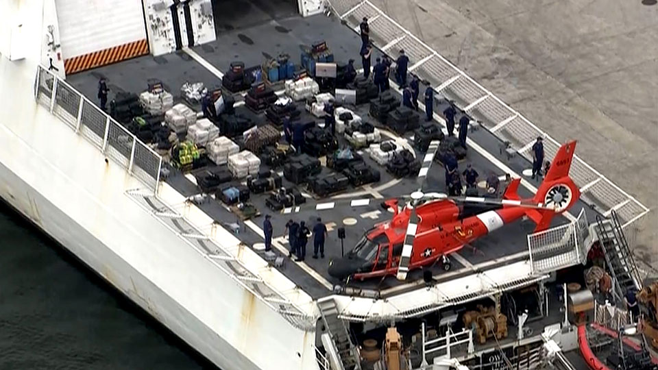 The crew of U.S. Coast Guard Cutter James will offload nearly 18.5 tonnes of cocaine, estimated at nearly C$659 million, at Port Everglades in Fort Lauderdale, according to CBS Miami. Dramatic video was released Thursday showing the apprehension of various boats with contraband — some tied together.