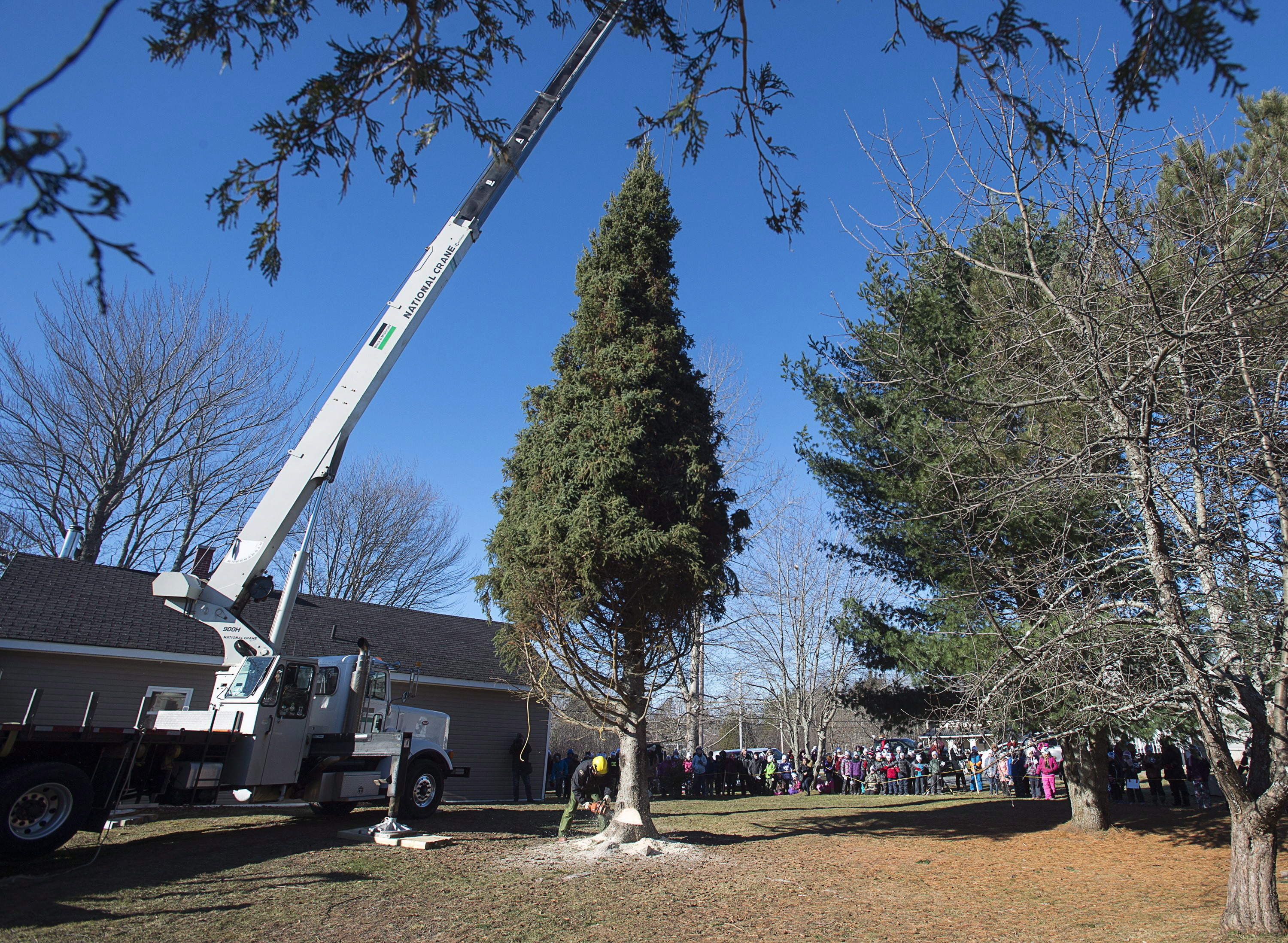 The “Tree for Boston” was carefully cut down this morning under blue skies as about 200 people watched, including carol-singing schoolchildren.