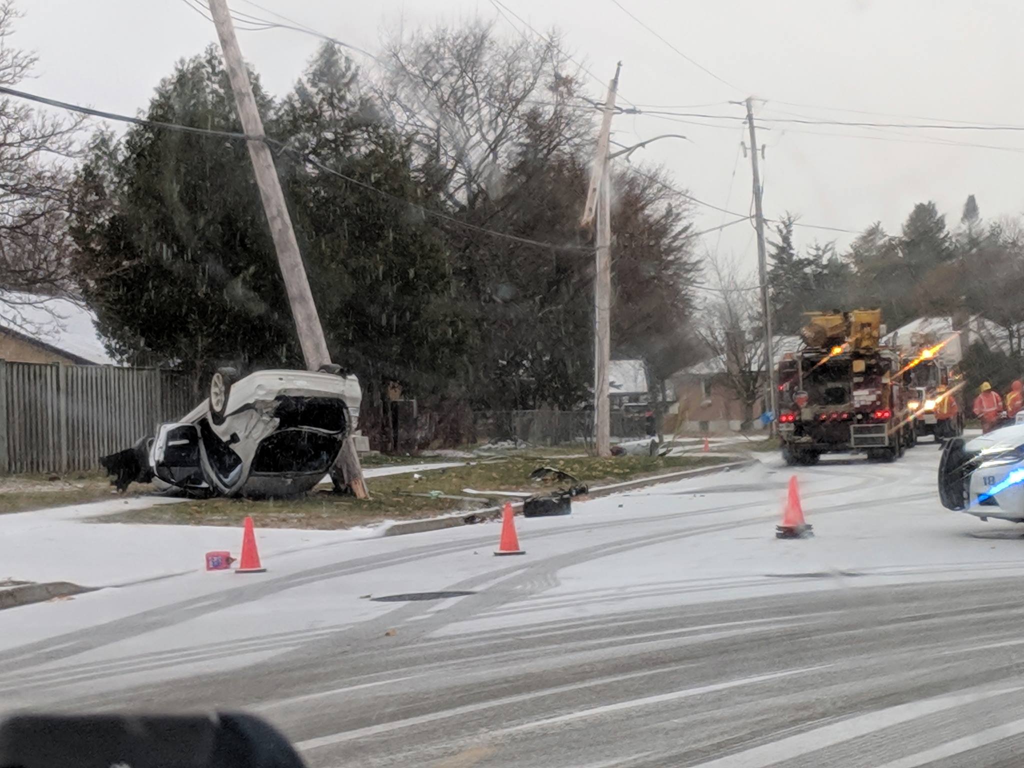The vehicle veered south of the roadway, struck a London Transit bus stop sign and a utility pole. The vehicle travelled more than 20 metres along a sidewalk, before hitting a second utility pole and coming to a rest.