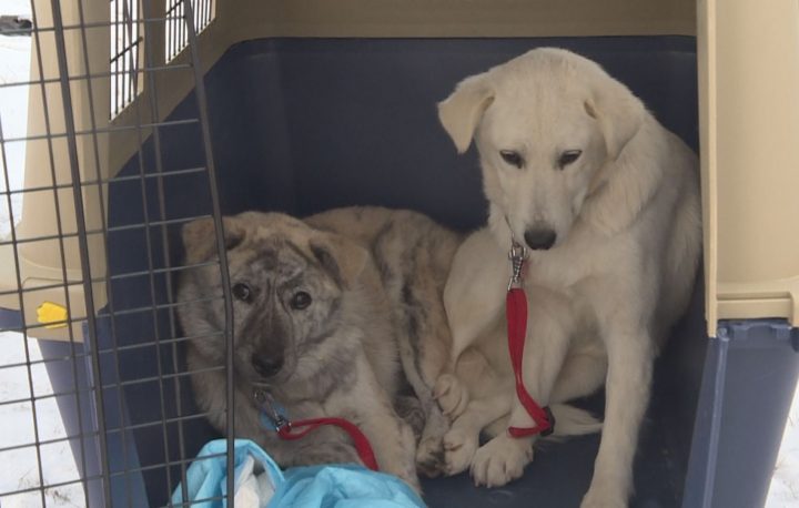 The dogs were born and raised for meat but with the help of an Alberta animal rescue group, the two canines are getting a second chance at life.
