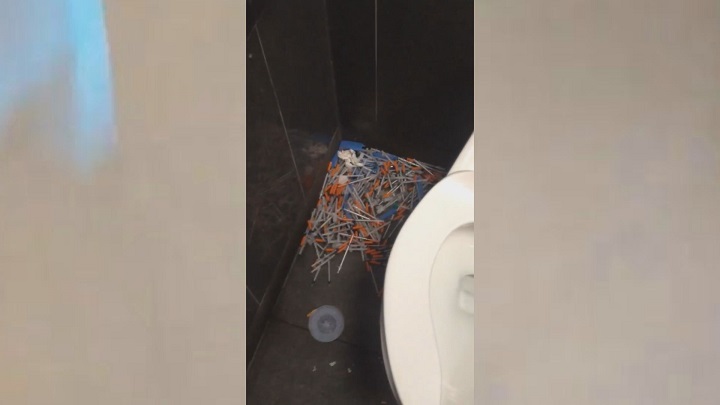 The video shows numerous needles on the floor and counter, including one needle filled with what appears to be blood.