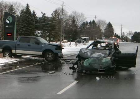 Police say a car was travelling eastbound near Stratford when the driver lost control and was struck by a pickup truck coming from the opposite direction.