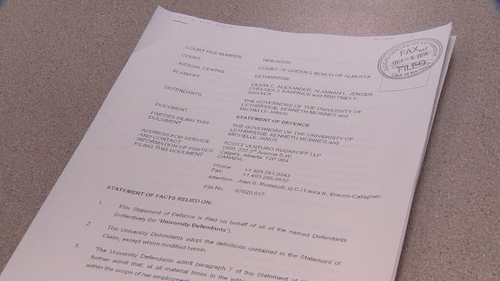 A statement of defence obtained by Global News is calling for a civil case against a University of Lethbridge coach and sports and recreation executive director to be dismissed.