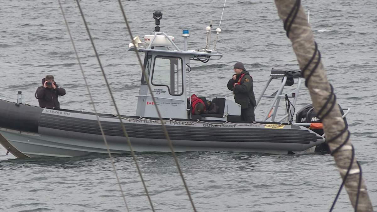 A rescue team from the Department of Fisheries and Oceans (DFO) and the Vancouver Aquarium were on the water in Cowichan Bay on Thursday, looking for the sea lion seen with a thick plastic band wrapped around its neck.