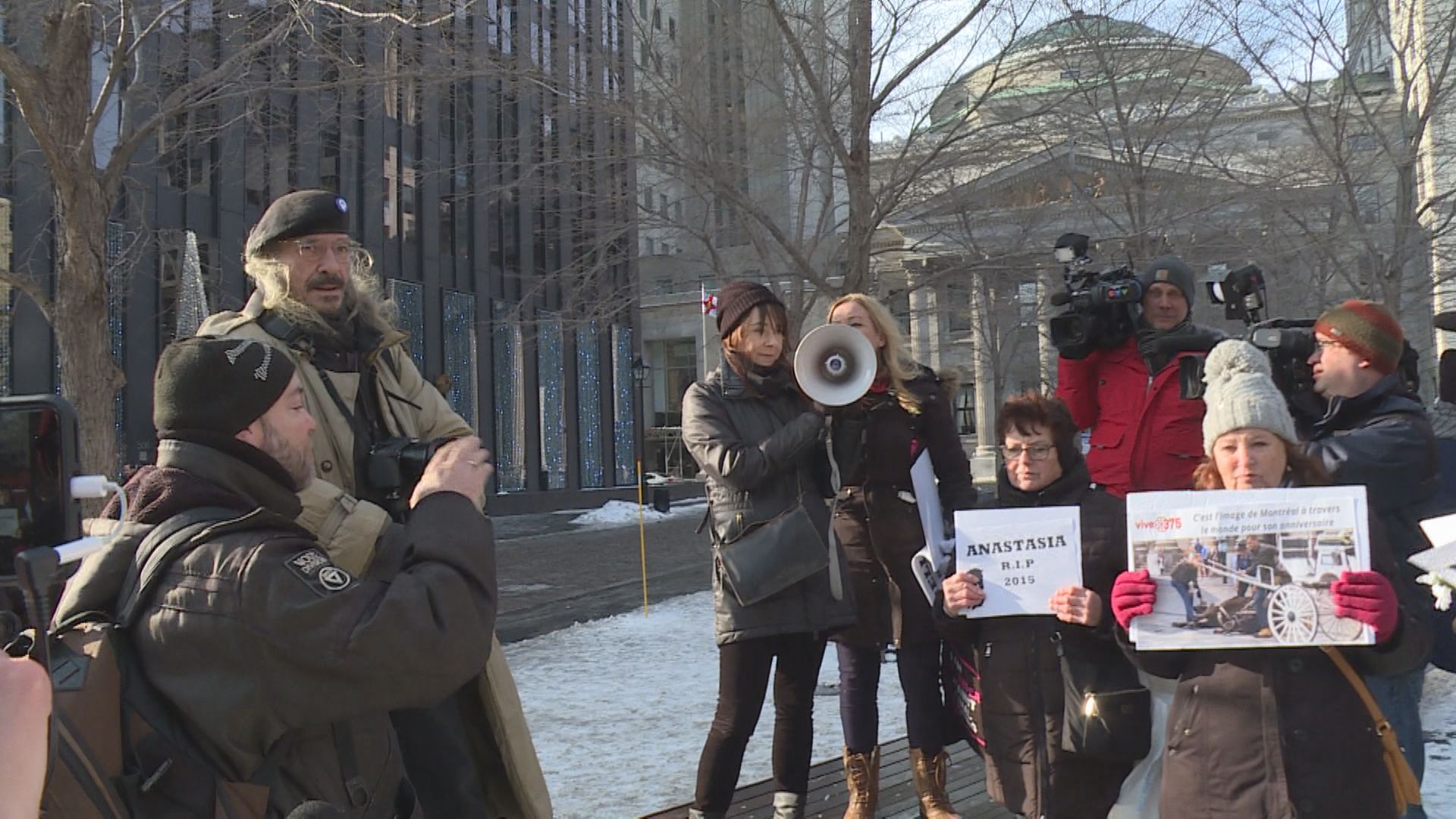 But as the demonstrators began giving speeches over a megaphone, a calèche driver started yelling over them and disrupting the protest.